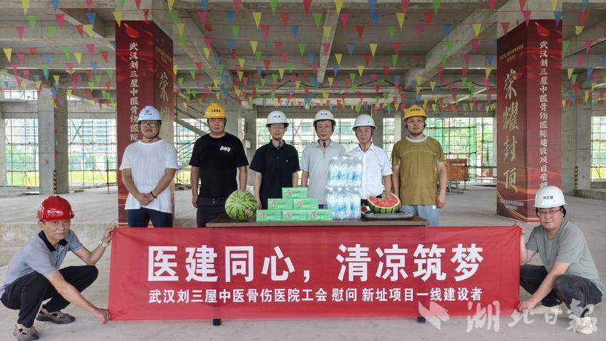 7月中旬正值酷暑,武汉刘三屋中医骨伤医院新址建设项目进入关键期。为保障高温下坚守岗位的一线建设者健康安全,7月18日,武汉刘三屋中医骨伤医院组织开展“医建同心,清凉筑梦”慰问活动,向奋战在烈日下的工人和管理人员传递特别关怀。