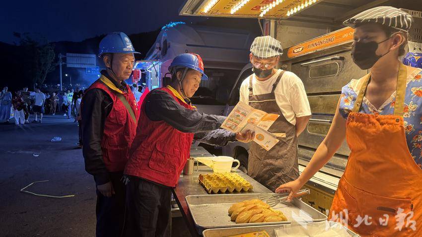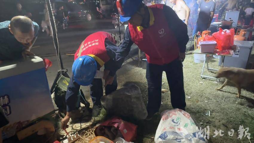 当日18时许,山风裹挟着草木清香,服务队队员们背着工具包,对夜市沿线临时用电线路、配电箱进行“问诊”:紧固松动接线、测试漏电保护器、检查光伏路灯续航……“盘山公路窄,晚高峰车流大,必须提前把隐患消掉!”队员王师傅一边调试设备,一边向围观游客解释。此时,距夜市启幕还有1个多小时,而这样的“前置巡检”,已成为国网武汉市新洲区供电公司服务夜市的日常。