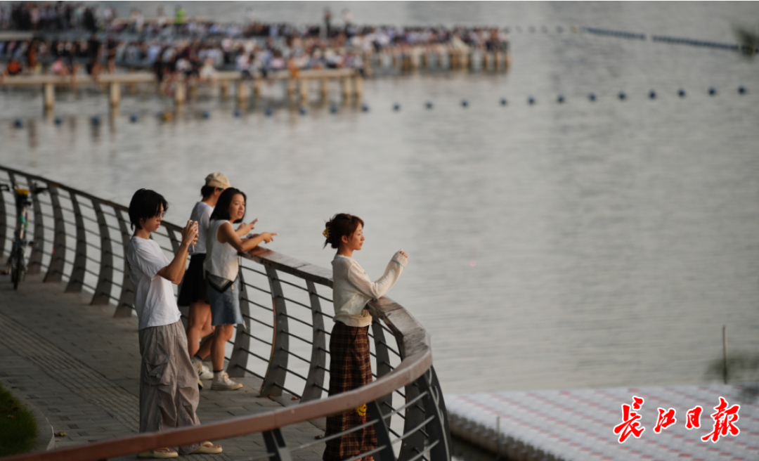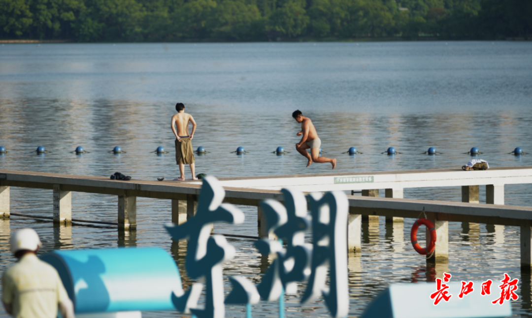 清晨,东湖凌波门栈桥已迎来首批“弄潮儿”。晨光熹微中,栈桥上早已人头攒动,成为天然的观景台与跳水平台。在这里观景的游客,默契地摆好自己的“长枪短炮”,等待阳光升起的那一刻。跃跃欲试的跳水爱好者们排着队,或一个猛子扎入水中,或摆出造型来个花式入水,溅起的水花引来岸上阵阵叫好与掌声。还有不少游客在浅滩嬉水、拍照,感受湖水的轻柔。带着水汽的湖风扑面而来,带走一身燥热。