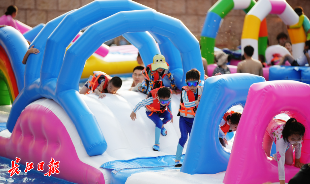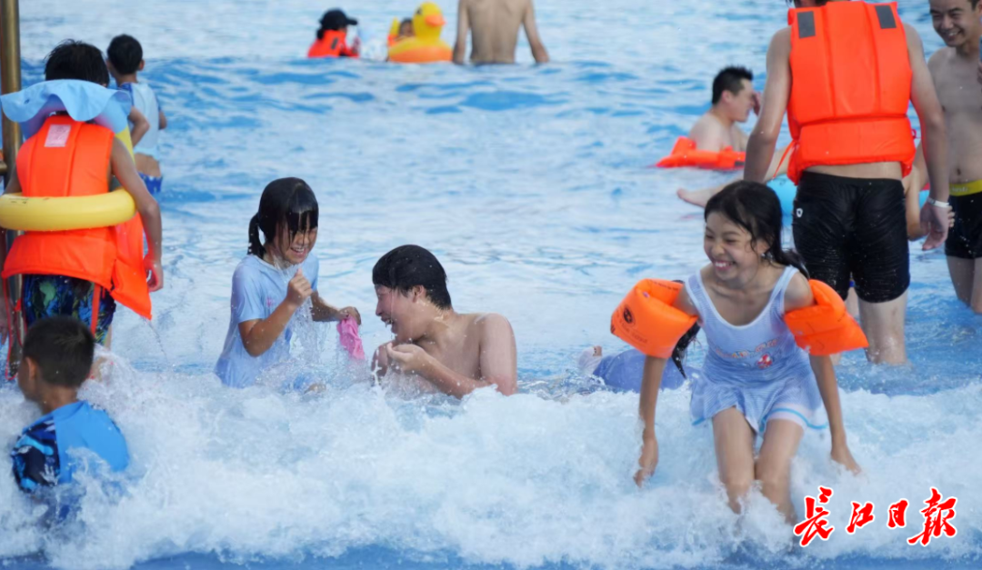 不远处,东湖海洋乐园内的东湖水世界欢乐十足。专为儿童设计的浅水戏水池内,迷你滑梯、蘑菇喷泉下聚集着蹒跚学步的“小鸭子”,父母在一旁笑意盈盈地看护着,安全员也在一旁守护着孩童们。从彩虹滑梯上急速滑下,临湖而下的设计让孩童们在体验速度与激情的同时,还能欣赏到东湖的美景,让清凉体验更添一份视觉享受。