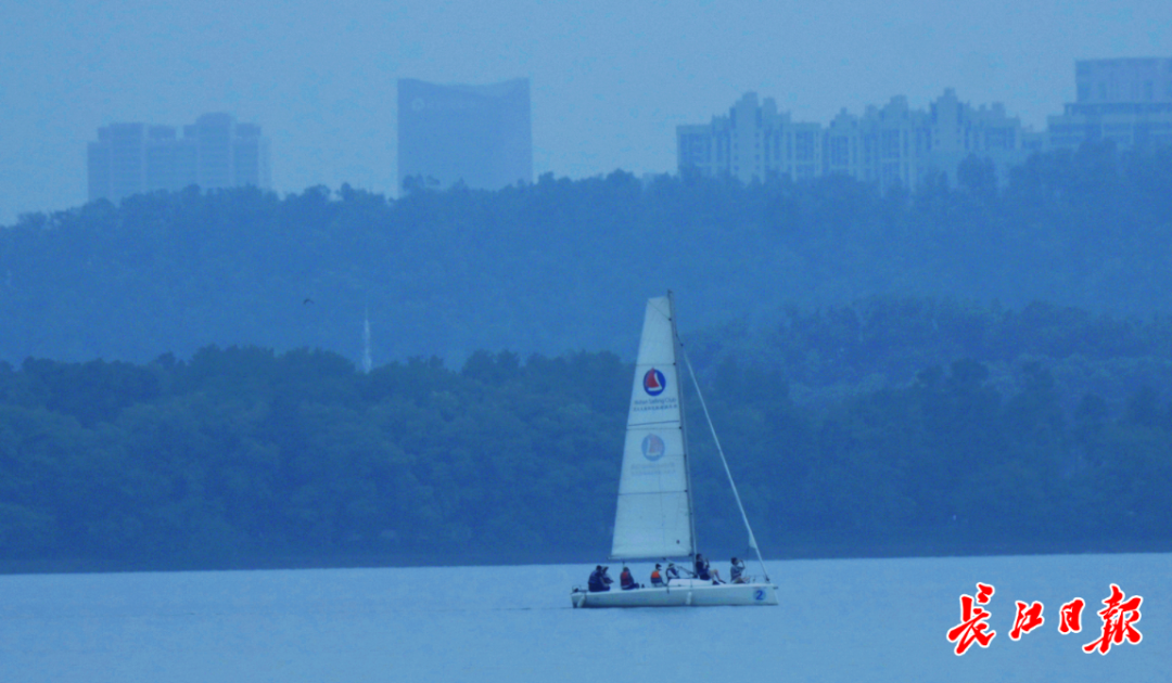 游客们正在东湖水上扬帆。