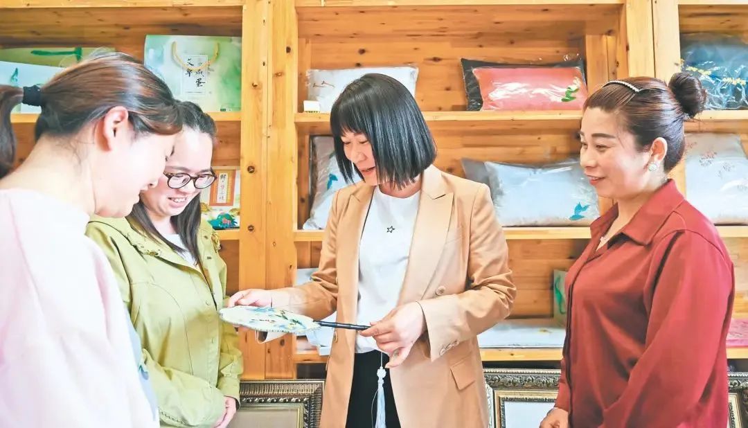 谢蓉向村民推广“牵花绣”。