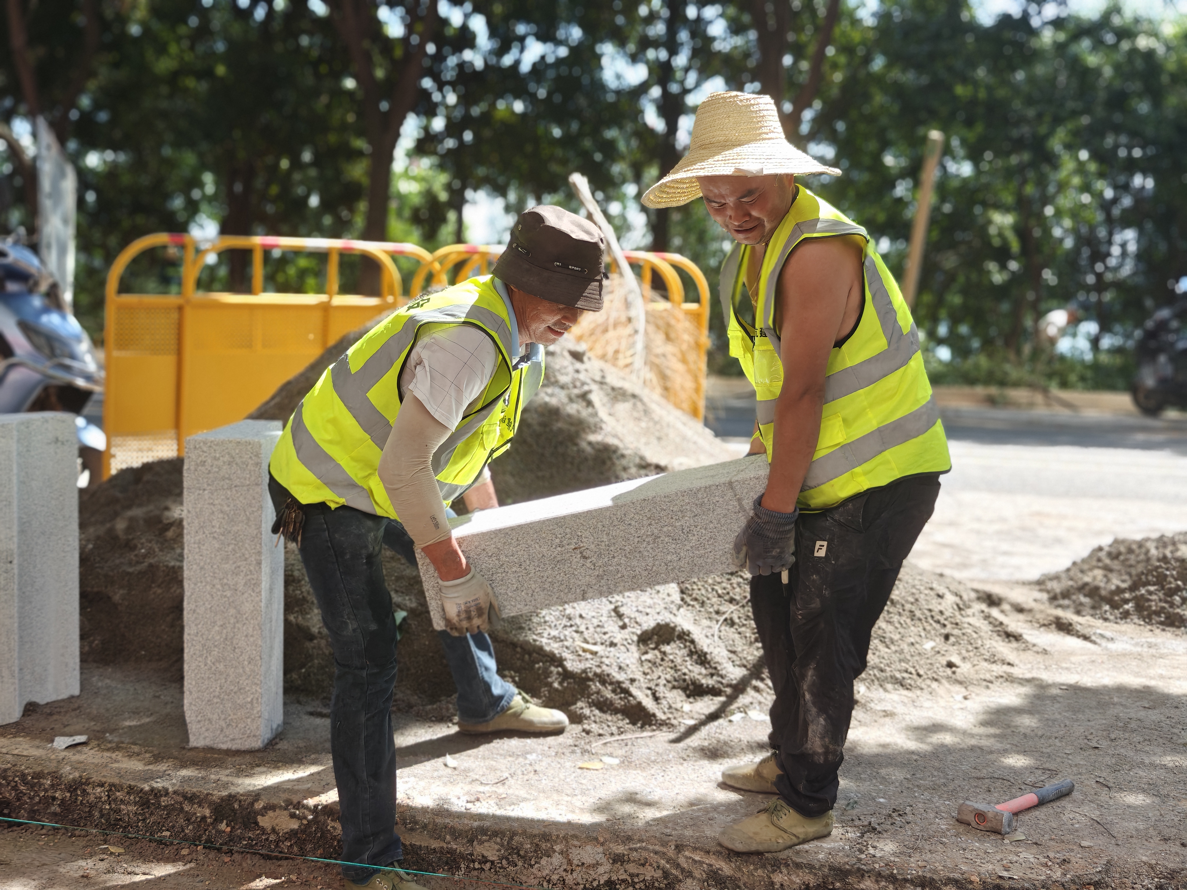 清晨5点,城市还未苏醒,工人们已抵达各作业点。切割机轰鸣,汗水迅速浸透工装。临近正午,地表温度飙升,阳光直射下,工人们全身汗水流淌,就连工服马甲上都凝结出片片白色盐渍。为了最大限度减少对交通的影响,他们避开早晚高峰时段,争分夺秒加快工程进度,每天高强度工作持续至傍晚6点。