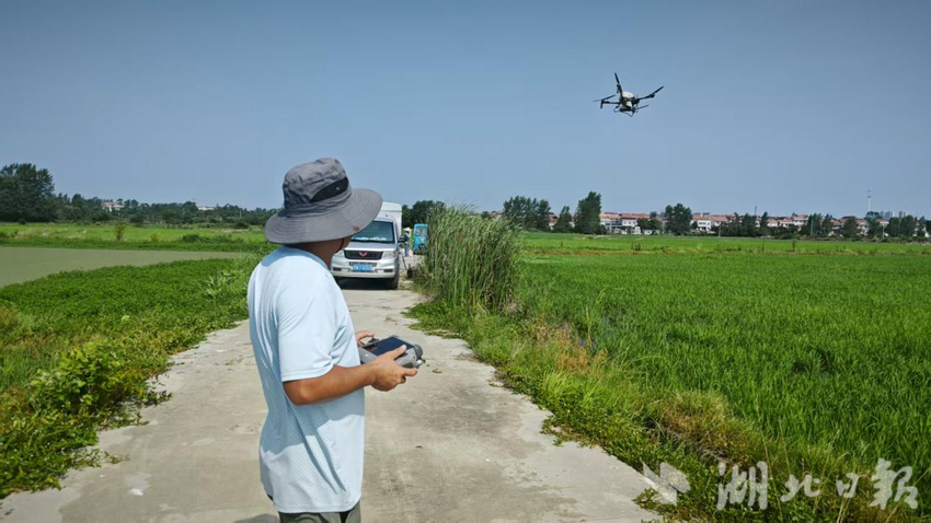 7月25日,武汉市新洲区辛冲街郭家山村,嫩绿的水稻随风起伏。烈日下,一名年轻人正熟练地操作着无人机,为周边农户进行精准飞防撒药作业。螺旋桨卷起的气流拂过水稻,也拂过他专注而黝黑的脸庞。他叫王兴,一名90后退役军人,如今是当地小有名气的“飞防”新农人。从军人到新农人,王兴的转型之路,诠释着新时代退役军人的担当。