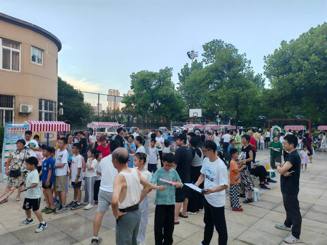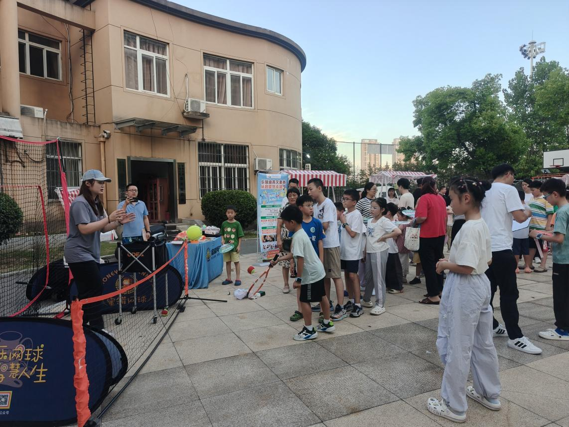 趣玩互动区成了孩子们的快乐天堂。来自辖区教培机构赞助的套圈小游戏吸引了众多小朋友参与,孩子们用套圈赢取小礼品,每套中一个礼品,围观的小朋友都大声欢呼。网球体验区,在教练的指导下,小朋友们开启网球体验,每打进一个球,收获周围阵阵掌声。炎炎夏日、酷热难耐,冷泡茶和十四小区物业提供的冰镇酸梅汤为居民送来阵阵清凉,家长们坐在长椅上边喝茶边聊天,工作上的忙碌情绪在阵阵夜话中渐渐消散,邻里温情在这里充分体现。