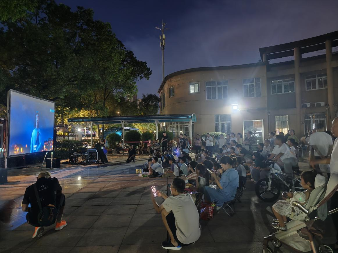 露天观影区,邻里沉浸在精彩的剧情中,乐享亲子时光。来自东西湖区绿委赞助的棕榈叶手工蒲扇编织活动受到大小朋友们的欢迎,在工作人员的指导下,居民们将翠绿的棕榈叶经过折叠、穿插、缠绕等步骤,逐渐编织成一把把古朴雅致的蒲扇。夜幕降临,广场屏幕上开始播放《长安三万里》影片,居民摇着蒲扇围坐观赏。“在家门口和邻居们一起看电影,很有氛围感,也让我想起了小时候大家挤在一起看电视的温暖。”居民李师傅感慨道。