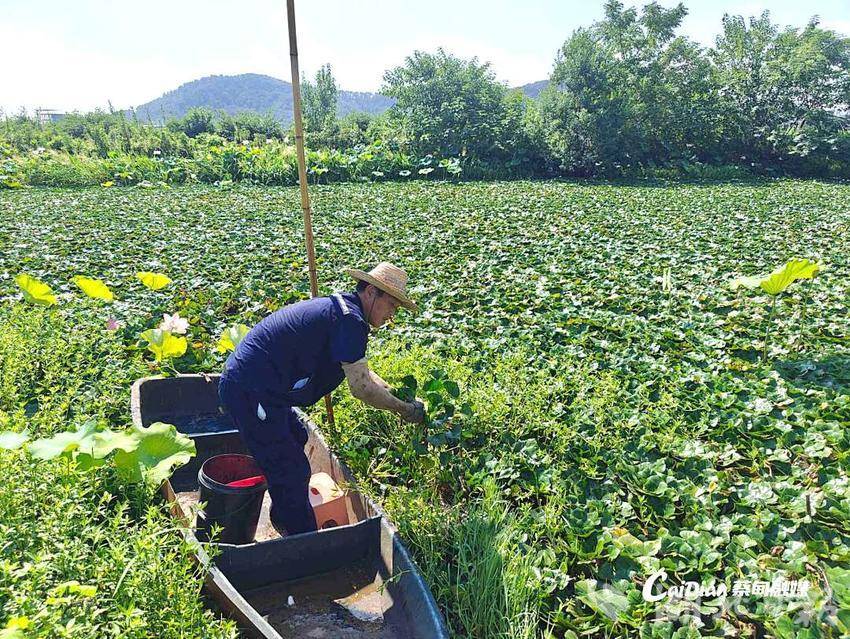 村内池塘中,碧绿菱叶如毯铺展水面。菱角种植户陈祥划动菱桶破水前行,双手灵活地翻开簇簇菱叶,提起植株摘下成熟菱角,再将其轻放回水中继续生长。