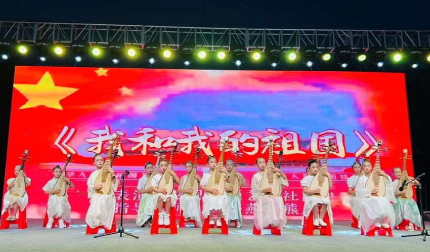 新民乐琴行的琵琶齐奏带来惊喜反转,《我和我的祖国》的旋律激昂响起,观众齐声合唱。