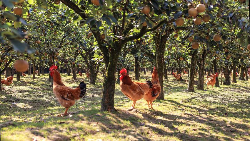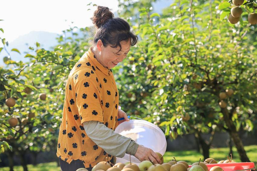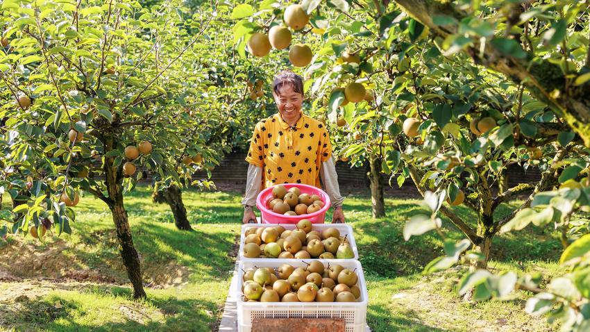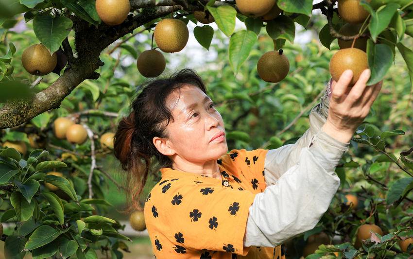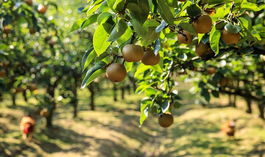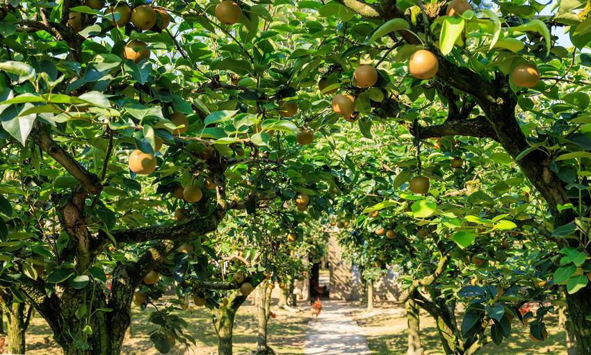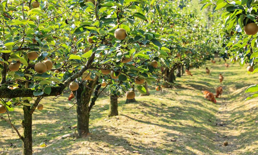 脸上挂满丰收喜悦的李大姐,给游客递过一个个金黄色的大梨,指着树下正在啄食的成群肥鸡肥鸭,说,生态梨呢,吃吧,吃吧,皮薄,核小,又脆又甜!