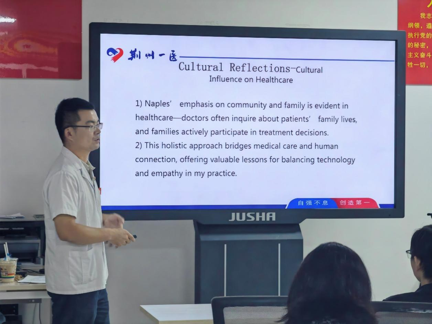 自创办以来,英语兴趣班凭借其丰富多样的活动形式和轻松愉悦的学习氛围,赢得了医院职工及规培学员的广泛关注与热情参与。本次沙龙活动首先由放射影像科主治医师姬广海分享在意大利那不勒斯Azienda Ospedaliera di Rilievo Nazionale dei Colli临床研修见闻。他以流利的英语、兼具诙谐与严谨的语调娓娓道来,将欧洲医疗系统的工作经历与意大利日常生活的趣事,栩栩如生地呈现在听众眼前。