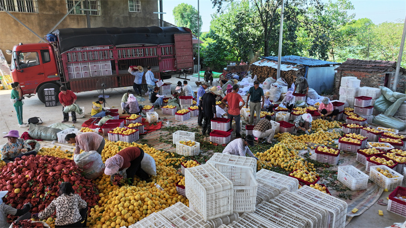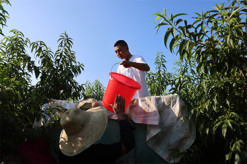 “今年这里的黄桃品质特别好,个大、颜色鲜亮、口感也棒。我们收购后,通过拼多多、美团等平台销往广州。”水果收购商李成说。