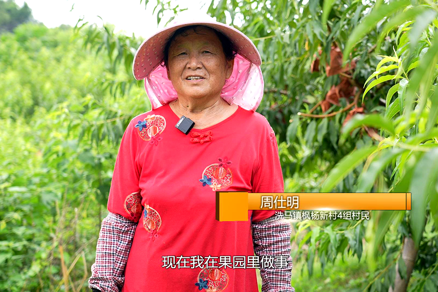 4组村民 周仕明:以前总在屋里种田,一点收入也没有。要是天干了,累得要死的,只管着肚子饱。现在我在果园里做事,一年搞到两三万块钱,又可以照顾家,非常好。