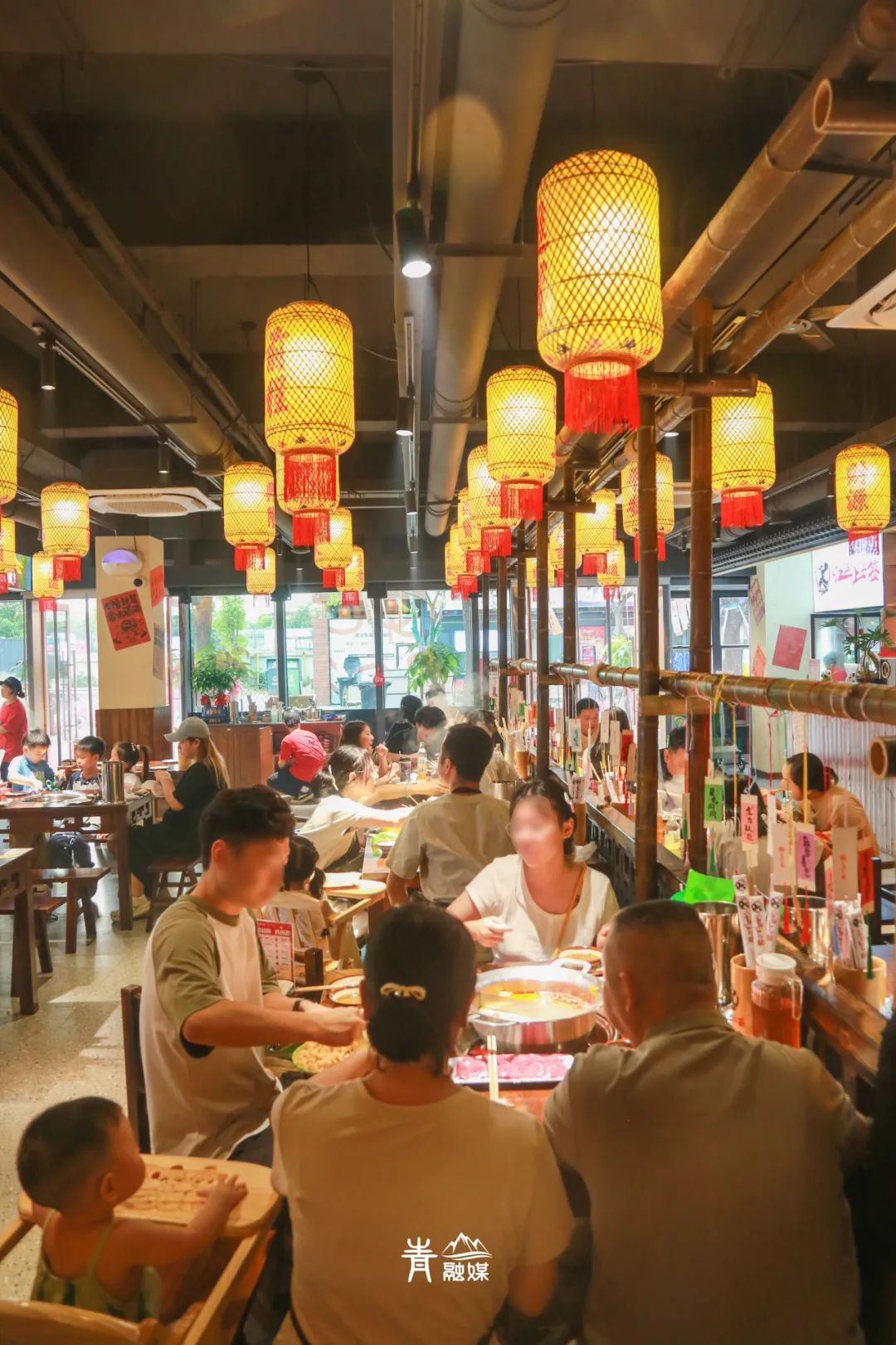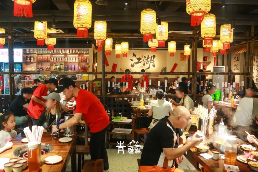 一走进店里,江湖气息就扑面而来。橙黄的灯笼瞬间把人拉入古风世界,茅草、蓑衣、竹子凭栏、灰色瓦当……“豪情”“武侠”“一锅煮江湖”笔锋遒劲的海报点缀其间,武侠韵味十足,让人仿佛置身“卧虎藏龙”的江湖梦。
