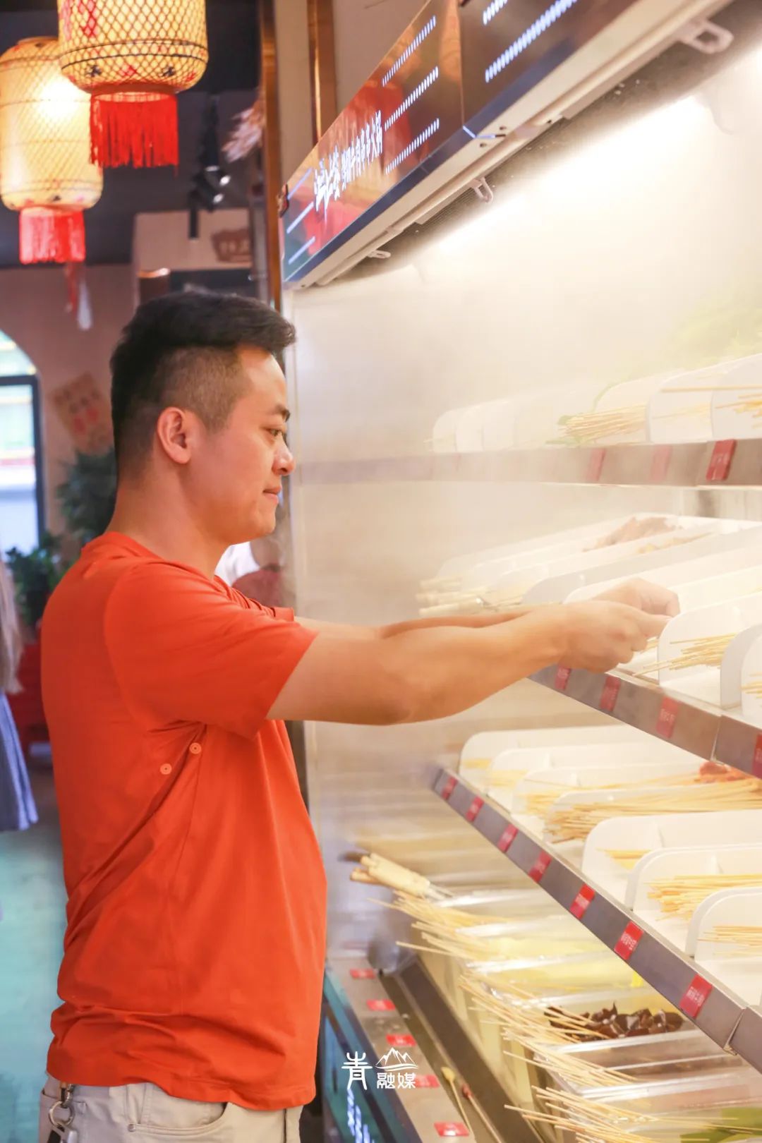 “他们家这个开放式冷藏柜,让我感觉像逛精品超市,食材看着就非常新鲜也方便挑选。”在冷气的氤氲中,近百种串串展示着美味的诱惑,谁都想多拿两串。