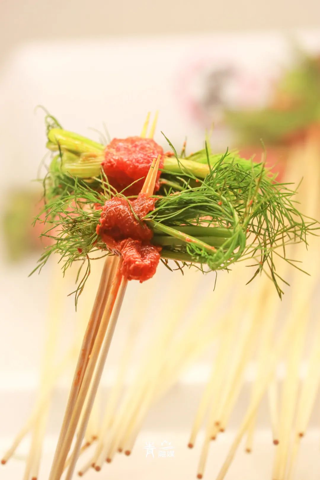 既在乎新鲜二字,更在意创新。没有跟风腌制单一口味的牛肉,小江把茴香、贡菜、香菜、薄荷,甚至更多意想不到的食材卷入牛肉中。只有未曾抵达的美味边界,没有他不敢串起的江湖。