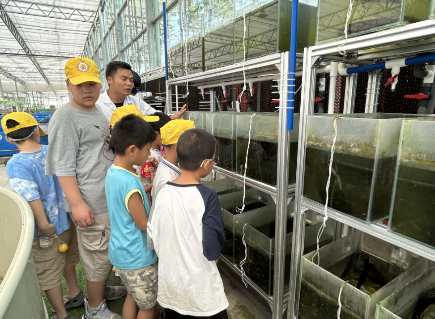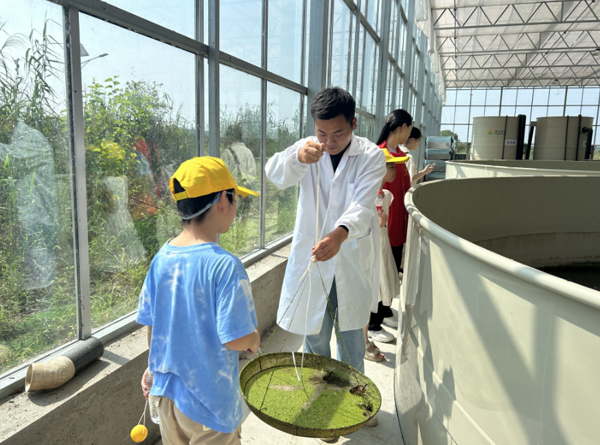 随后,孩子们走进智能温室大棚,恒温控制系统、立体养殖池等现代化设施令他们目不暇接。当得知这里能实现“四季有虾”时,向中社区学员周圣钦兴奋地说:“冬天也能吃到新鲜龙虾,科学家叔叔真厉害!”研究院技术员还特意向孩子们展示虾稻共作模型,详细阐释“一水两用、一田双收”的生态智慧,让孩子们对家乡这一特色产业有了更深刻的认识。