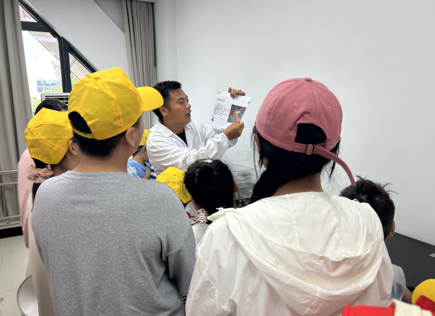 活动中,孩子们在志愿者的带领下来到研究院研发中心。青科突击队代表周自明以趣味小实验开场,生动演示了克氏原螯虾的生理特性。“原来虾壳颜色会随水质变化!”“它们的前螯像一对大钳子!”实验台前,孩子们的好奇心被充分激发。青科突击队队员用通俗易懂的语言,向孩子们讲解龙虾育种、养殖等核心技术,现场欢笑声与惊叹声此起彼伏。
