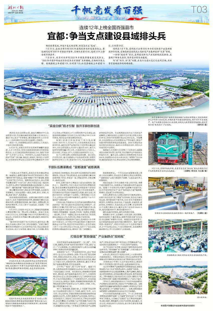7月23日,在北京举行的2025年县域经济创新发展论坛上,赛迪顾问发布2025年百强县市榜单,宜都位居第62位,连续12年上榜全国百强县市。
