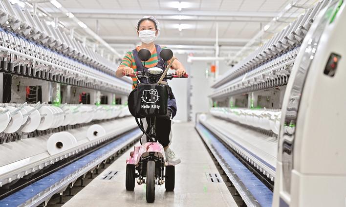 合生纺织智能化生产车间,工人正在骑车巡检。