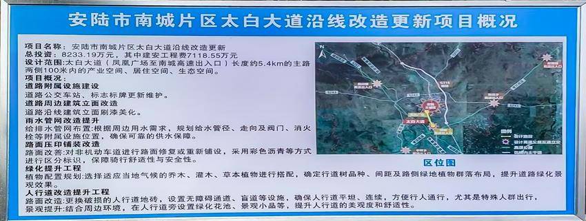 湖北日报客户端讯( 通讯员黄伟力) 近日,安陆市南城片区太白大道沿线改造更新项目正式启动。据悉,改造更新工程北起凤凰广场,南至南城高速出入口,全长5.4公里,总投资8233.19万元。
