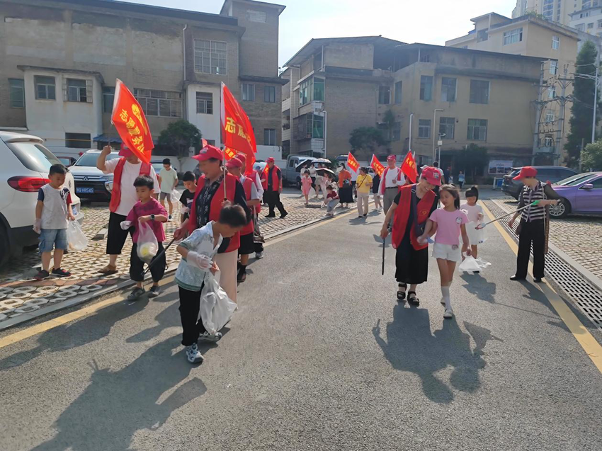 “小朋友们,要紧跟着爷爷奶奶的脚步喔……”,老年志愿者们化身“环保导师”,一边示范,一边讲解环保知识。孩子们听得认真、学得专注,很快就投入了清洁家园的行动中。他们沿着社区公共停车场、鞍山西巷、腾龙广场等小区出发。老年志愿者们动作娴熟,弯腰清理杂草,不放过任何死角;孩子们也干劲十足,有的捡拾烟头,有的清理绿化带中的垃圾;面对角落里难以清理的烟头纸屑,老少俩一起动手,你捡我装,配合得格外默契。阳光洒在他们身上,汗水浸湿了衣衫,却丝毫没有减退大家的热情,欢声笑语不时回荡在社区的各个角落。