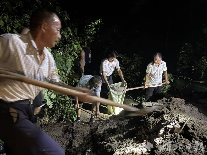 18时50分,10余支手电划破夜幕。一支由老党员、退役军人、村组干部和群众等30余人组成的抢险队,如一把尖刀迅速插向险段。