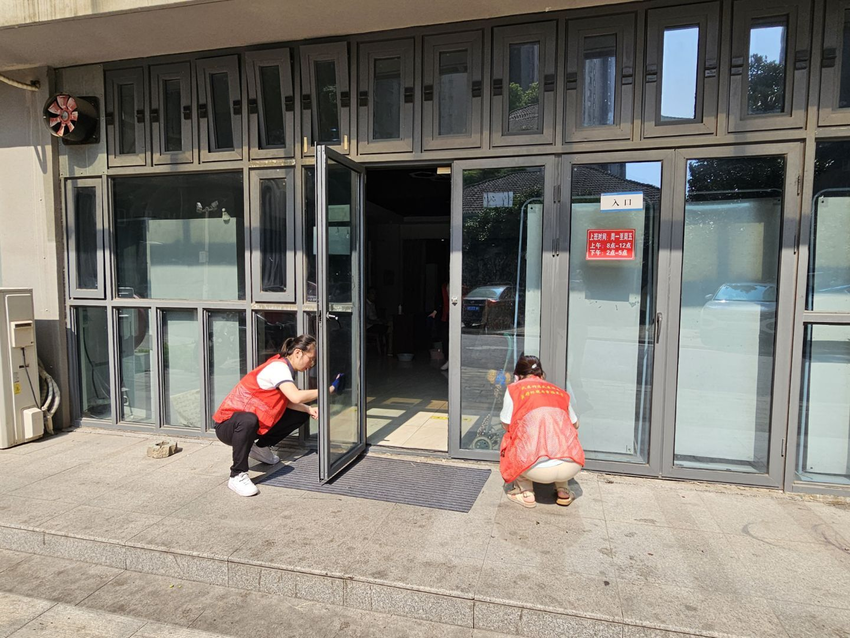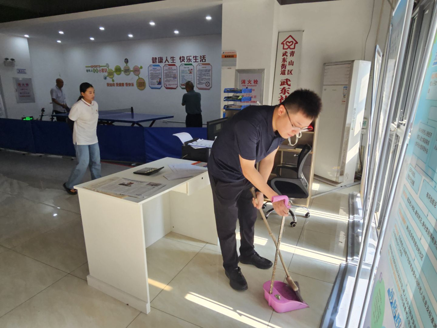 最后,市金控集团来到社区老年人活动中心,和社区志愿者们一起打扫活动中心卫生,在不影响老年人正常活动的前提下,他们抹桌子、擦玻璃、扫地、冲洗卫生间……每一个人都是带着真心过来提供帮助的。
