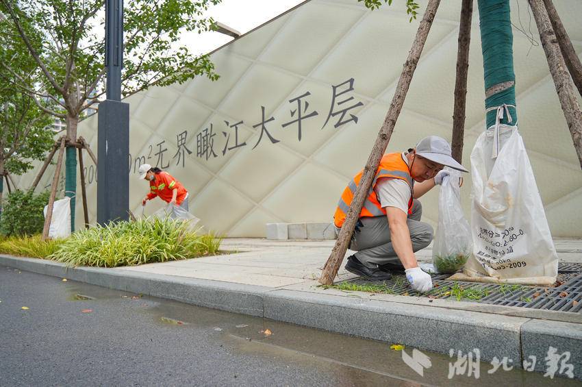 上午8时整,在武昌区城管执法局执法大队的组织下,长江中心项目施工方中建五局第三建设有限公司、武汉鼎吉建筑工程有限公司30余名施工人员率先对工地周边人字沟淤泥、建筑垃圾及大型杂物进行集中清理,重点打通排水通道以消除蚊媒滋生隐患。随后,二桥清洁队环卫人员分工合作,细致地清扫着路面上散落的纸屑、落叶、塑料袋等各类废弃物。对绿化带、树穴等平日难以顾及的卫生死角进行“地毯式”搜索,用钳夹精准地清捡深藏的烟蒂、纸屑,并仔细拔除丛生的杂草,同步完成果皮箱擦洗、城市家具冲洗。