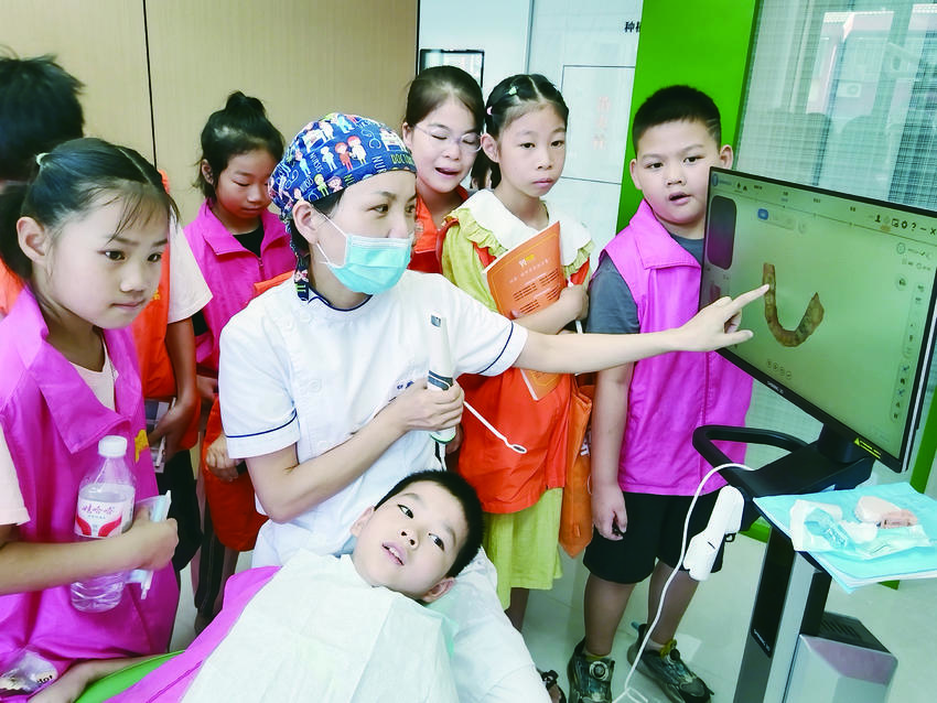 近日,天门市小牛顿科普中心组织40多名竟陵街道陆羽社区、东湖社区的青少年来到市口腔医院城北门诊部,开展“小小牙医”口腔健康研学活动,通过科普讲座、刷牙示范、口腔检测等趣味化、场景化的体验式学习方式,让孩子们了解护牙小知识。湖北日报客户端讯(通讯员付磊磊、邓慧遐 摄)