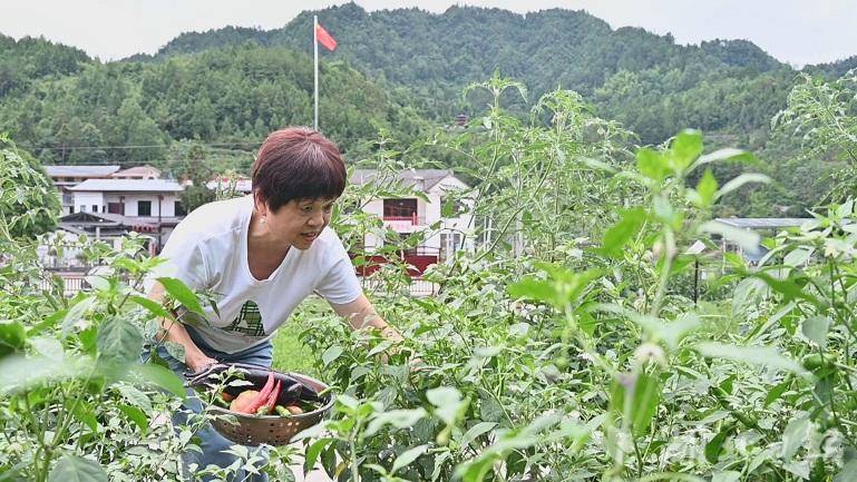 在一家民宿的共享菜园里,鲜红的番茄、翠绿的辣椒挂满枝头,从武汉前来避暑的游客吴淑英正和朋友兴致勃勃地采摘着新鲜蔬菜,脸上洋溢着喜悦。