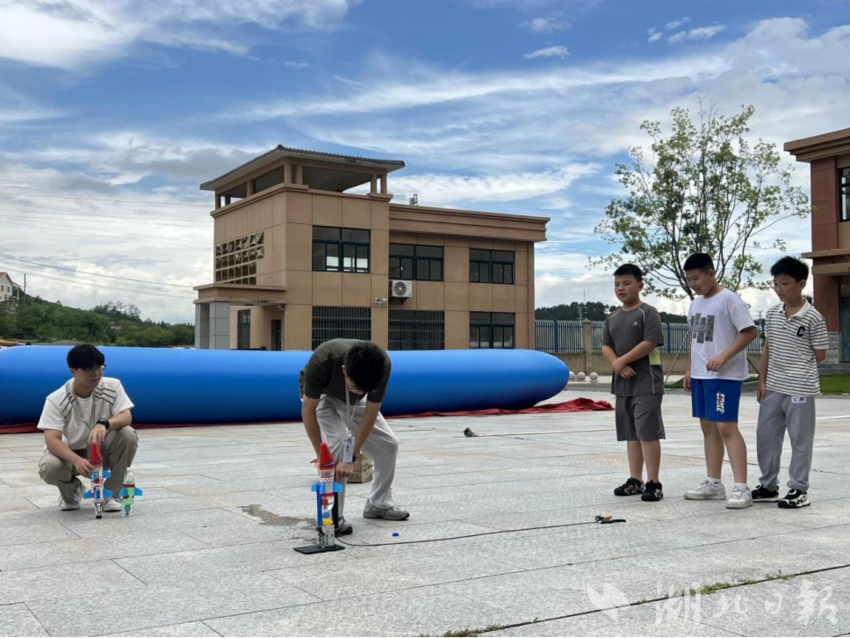 实践环节,志愿者刘成茂带领学生们在操场动手制作简易水火箭。随着“3、2、1,发射!”的口令,水火箭成功升空。学生们兴奋地仰头观看,欢呼雀跃。航天探索从屏幕中的影像,变成了学生们亲手实践的体验。
