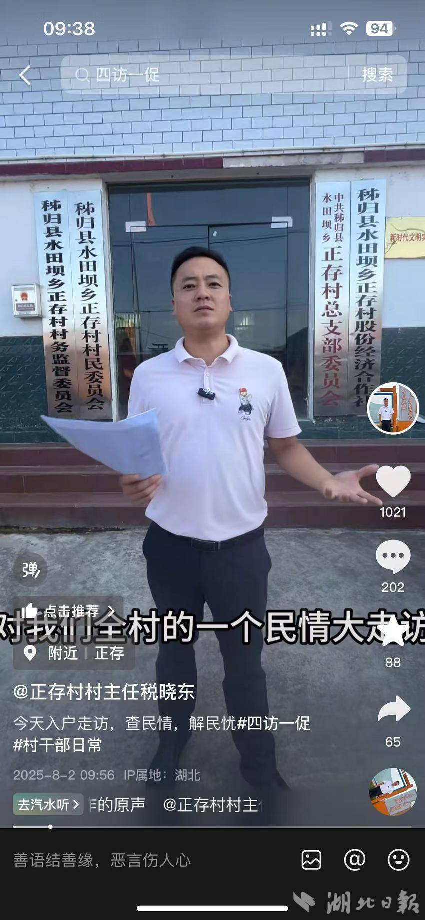 湖北日报客户端讯(通讯员熊晓晓)“老寇叔,感谢您提的这些宝贵建议,相信有了这些建议咱们村的发展会越来越好!”近日,在某直播平台的直播间里,秭归县水田坝乡正存村村主任税晓东一边走在乡间小路上,一边对着手机屏幕,用地道的乡音宣传介绍着正存村。最近,他结合乡里“四访一促”民情大走访活动想出的新点子:把入户走访、倾听民意的过程,直接变成抖音短视频的素材。他拿着手机,走进农家小院,蹲在田间地头,把村民们关心的医保报销、养老补贴、柑橘病虫害防治等热点问题,掰开了、揉碎了,用最朴实的话讲给大家听。
