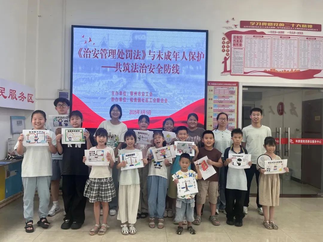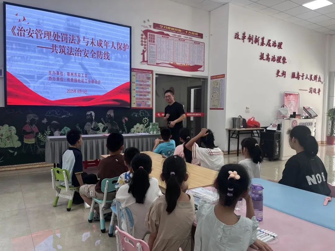 8月5日上午,和贵园社区党群服务中心内笑声与掌声交织,一场别开生面的法治教育课在此热闹开展。鄂州市总工会主办、和贵园社区工会联合会协办的普法活动,通过趣味讲座、互动游戏和创意绘画等形式,为20余名暑期托管班儿童及家长代表、青年志愿者送上了一堂生动的“法治启蒙课”。