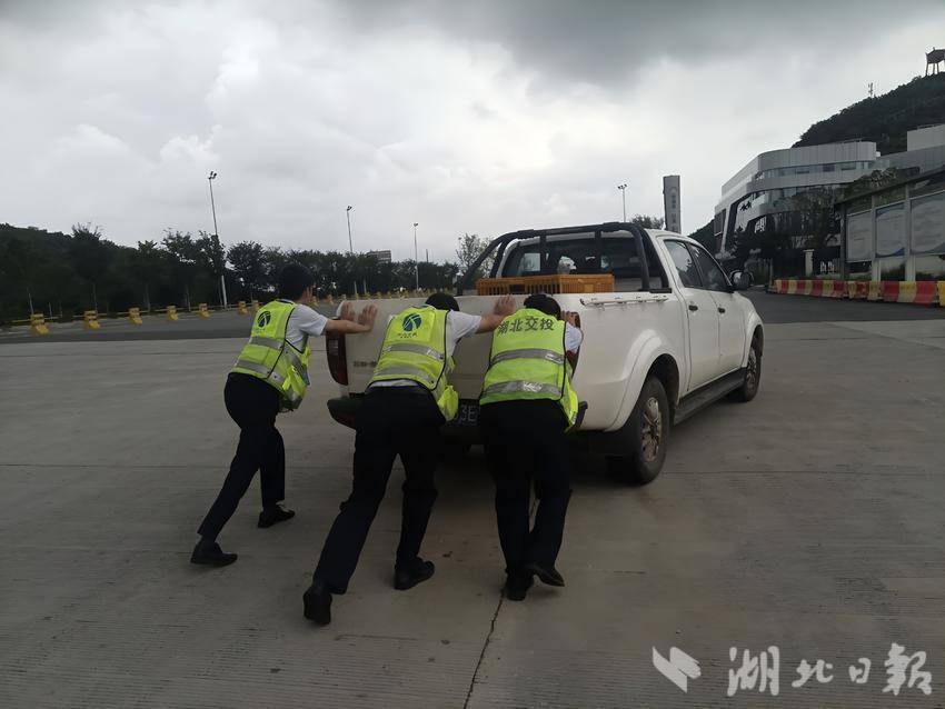"车身太重,大家一起使劲!"收费班长陶杰抹了把糊住眼睛的汗水。2吨重的皮卡在狂风中有如生根,三人抵住车尾,在呼啸的风声中喊着整齐的号子。当班收费员紧盯后方来车,手中的指挥棒划出醒目的光弧。