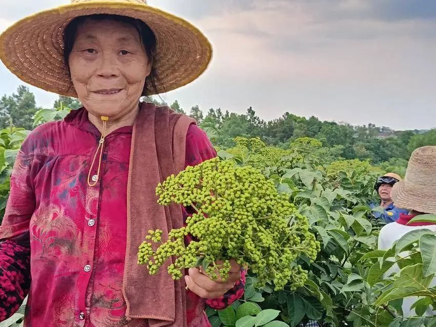 在基地里,65岁的脱贫户王大娘熟练地剪下果穗,脸上洋溢着笑容,她说:“过去,这里全是荒山坡,现在种上吴茱萸,我们这些老人每天能挣百八十块,家门口就能补贴家用!”