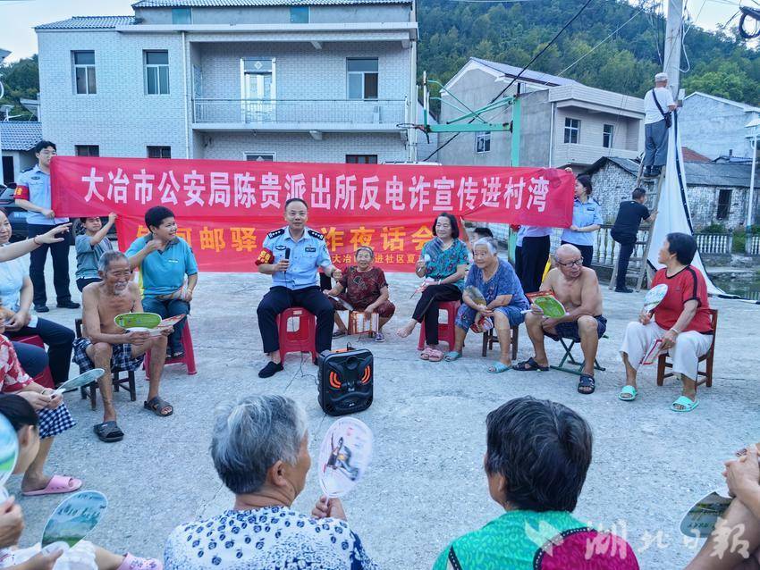 湖北日报讯(通讯员 马一鸣)8月8日晚,大冶市陈贵镇华垅村方泔湾的村民们迎来了一场别开生面的“安全夜课”。大冶市公安局陈贵派出所教导员金志明带领反诈志愿者小队,联合邮政储蓄银行陈贵支行工作人员,利用村民晚间闲暇时间走进村湾开展综合安全宣传,通过“零距离”宣讲和互动,织密乡村安全防护网。