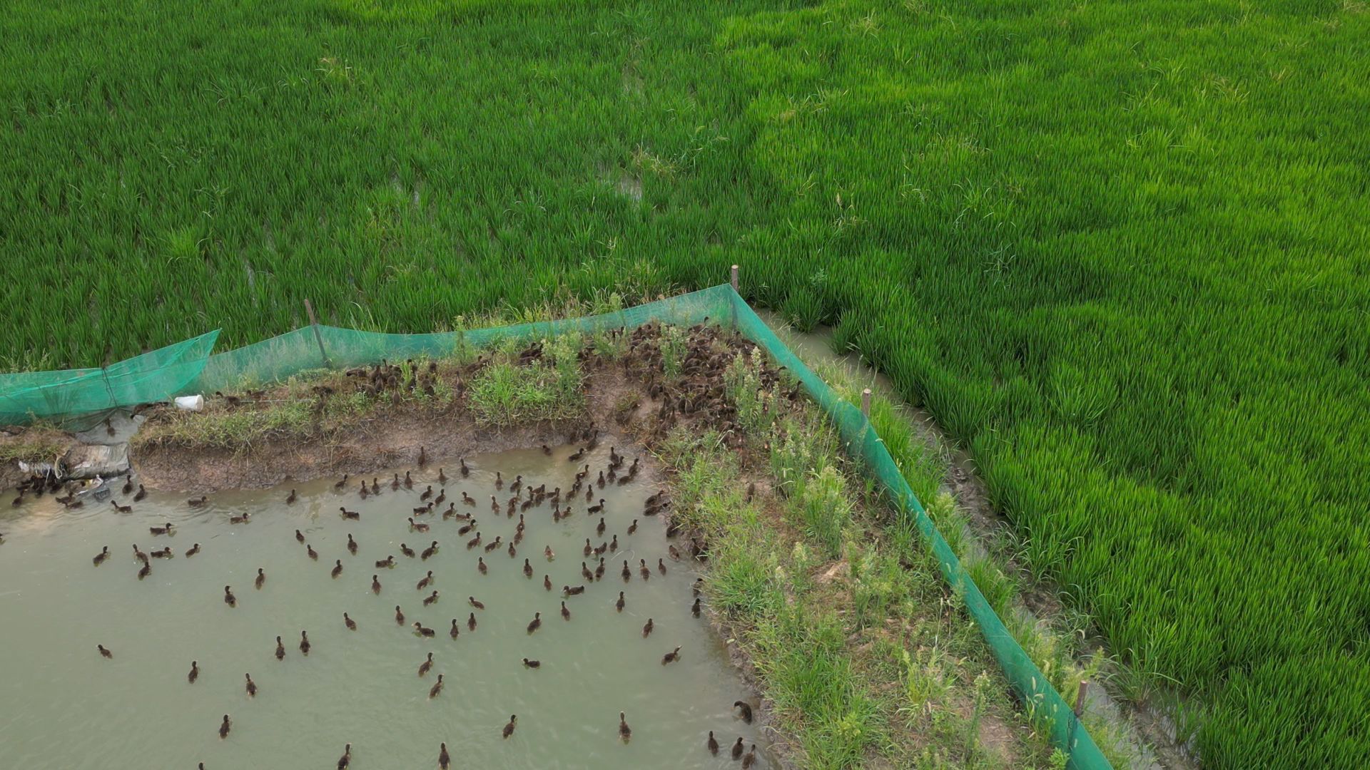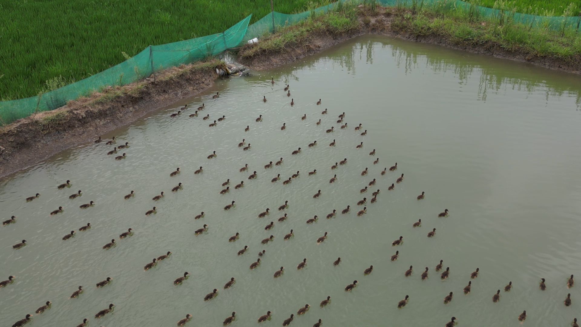 放眼望去,连片的翠绿稻田间,麻鸭时而在稻丛下低头精准啄食杂草与害虫,时而在水田中追逐嬉戏,搅动起富含养分的泥水,一幅活力四射的田间生态图跃然眼前。