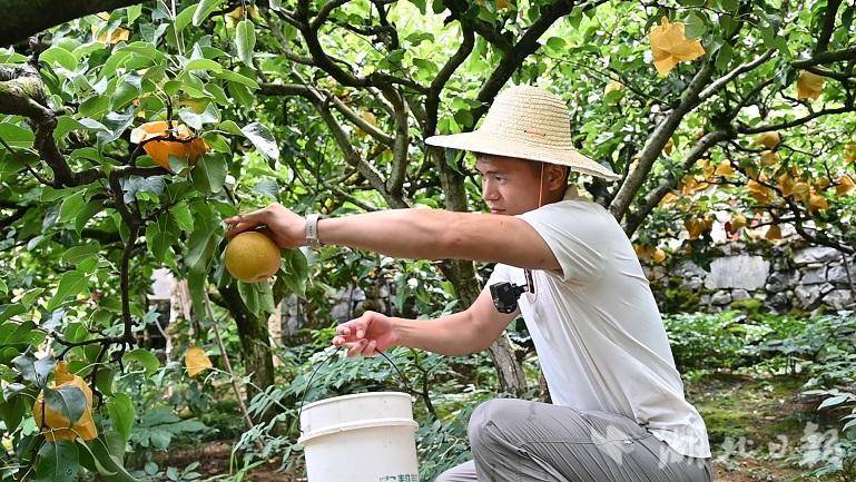 “听说今天椒园搞采摘节,我就带着我媳妇和朋友们一起上来,去梨园里摘了梨子,体验感很好,也希望不管是本地的还是外地的朋友,都可以过来体验,非常不错。”王成开心地分享道。