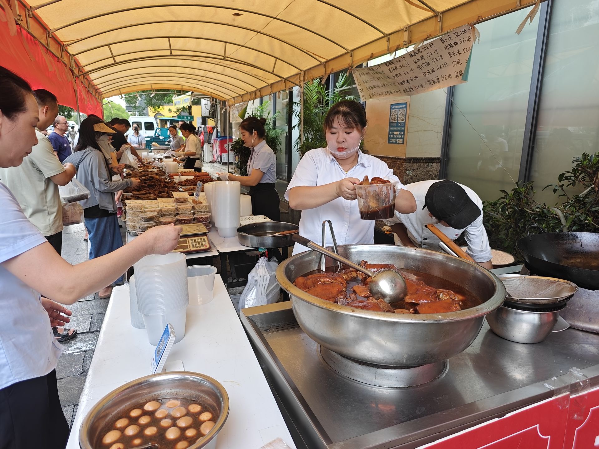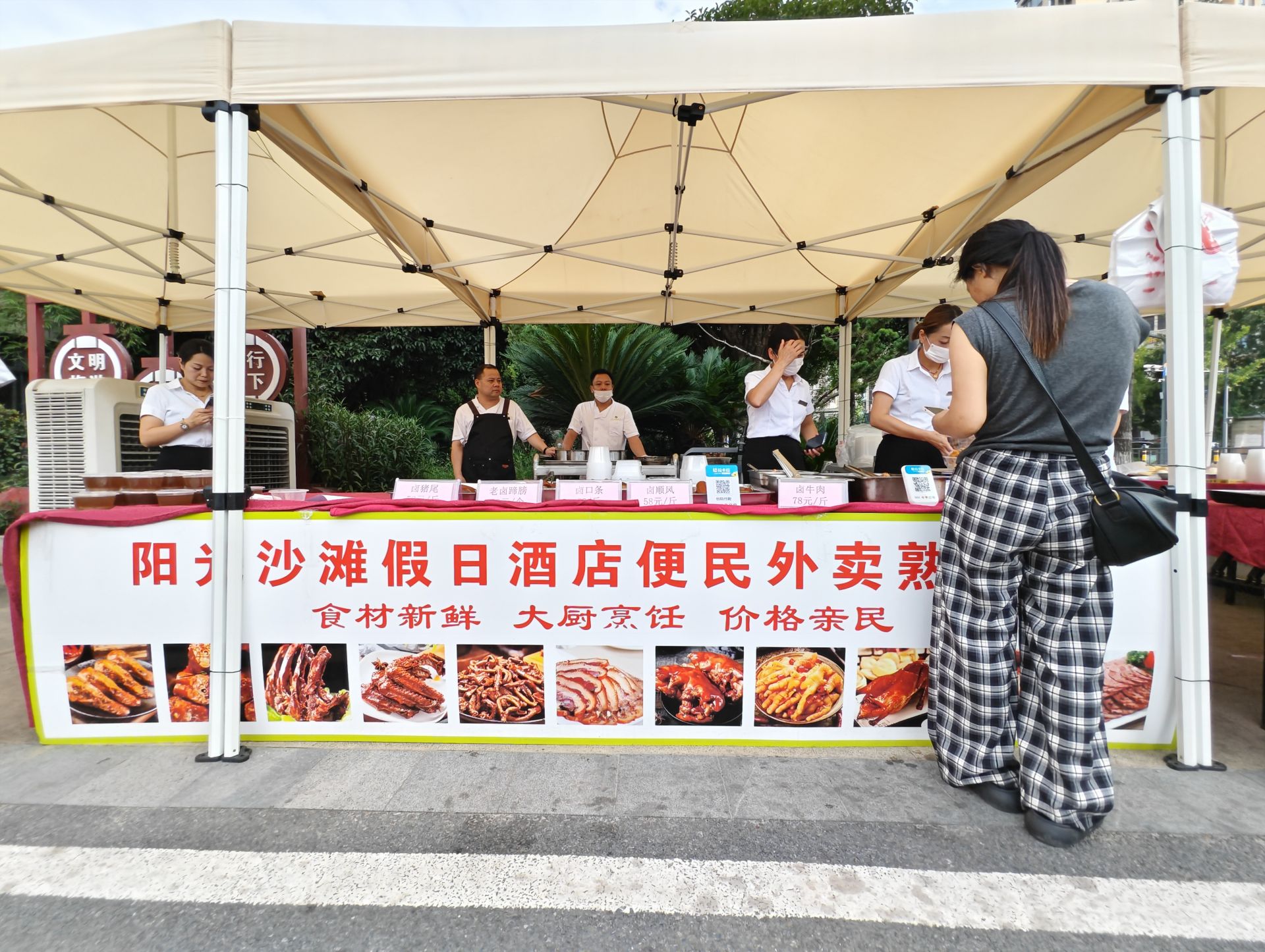 “食材每天7点采购,下午2点开始卤制,保证4点出摊时还是新鲜热乎的。”正在招揽顾客的店长胡建介绍道,目前参与摆摊的都是酒店在职的厨子、服务员、餐厅经理,就是希望在熟食的销售过程中,让所有顾客都体验原汁原味的“老传统”味道。