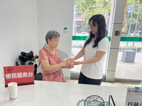 (图为便民服务台客户经理为办事群众送上凉茶)