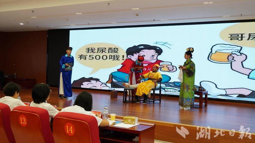 比赛现场,创意情景剧《甄嬛传之“痛风篇”》成为亮点。剧中,身着清朝官服的“太医”为“皇上”把脉问诊,“皇上,您这不是中邪,是痛风发作啊!”“温太医的意思是朕以后再也不能大口吃肉、大口喝酒了”等幽默台词,生动形象地讲解了痛风防治知识,引得现场观众笑声不断。