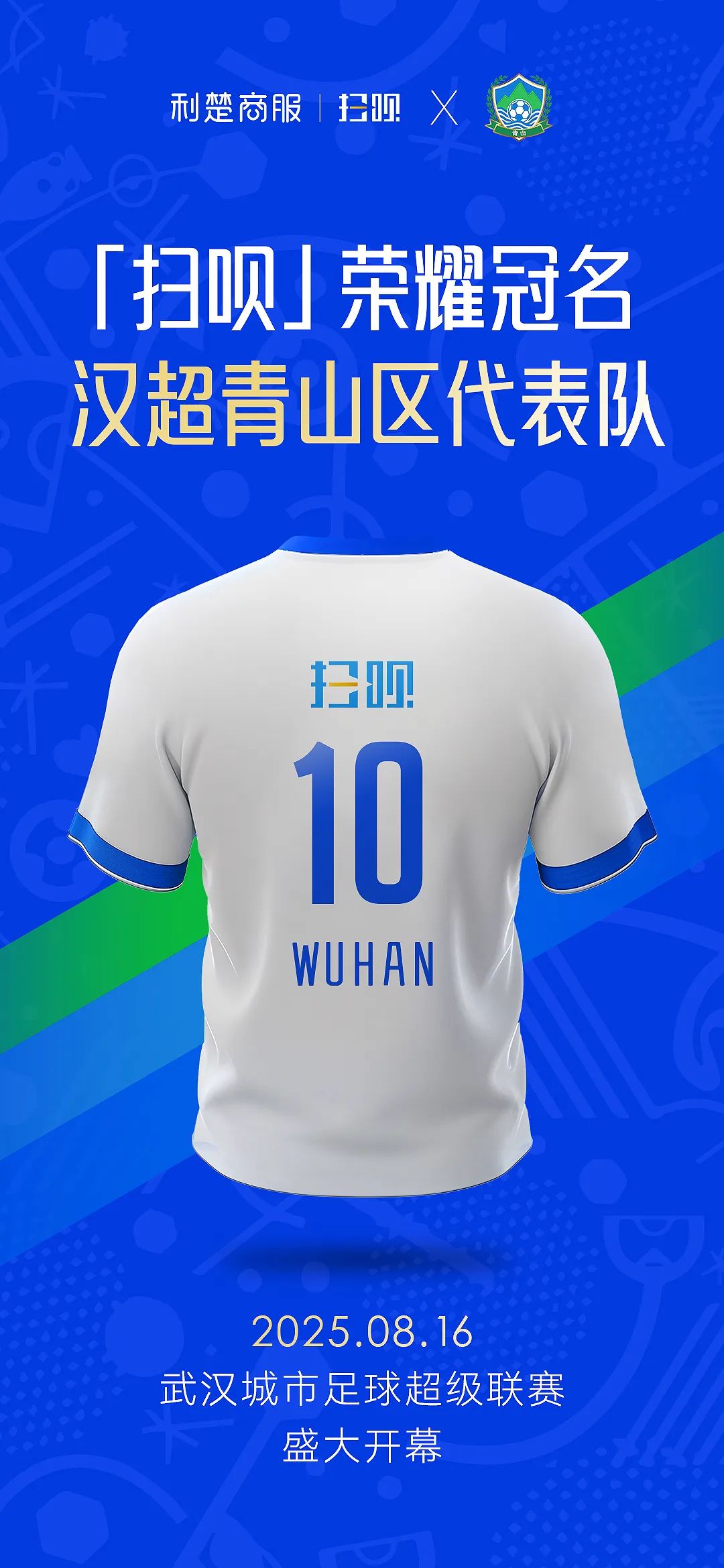 来自青山的本土企业对本届汉超赛事给予了坚实支持,武汉利楚商务服务有限公司旗下知名聚合支付品牌“扫呗”,正式以主冠名商身份支持青山区代表队征战首届汉超赛事。