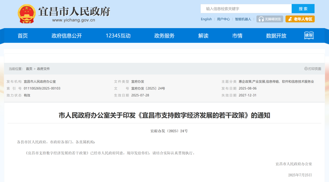 宜昌市人民政府办公室近日印发《宜昌市支持数字经济发展的若干政策》,从优化产业布局、促进算力应用、和加强市场主体培育等方面推出10项干货满满的举措。