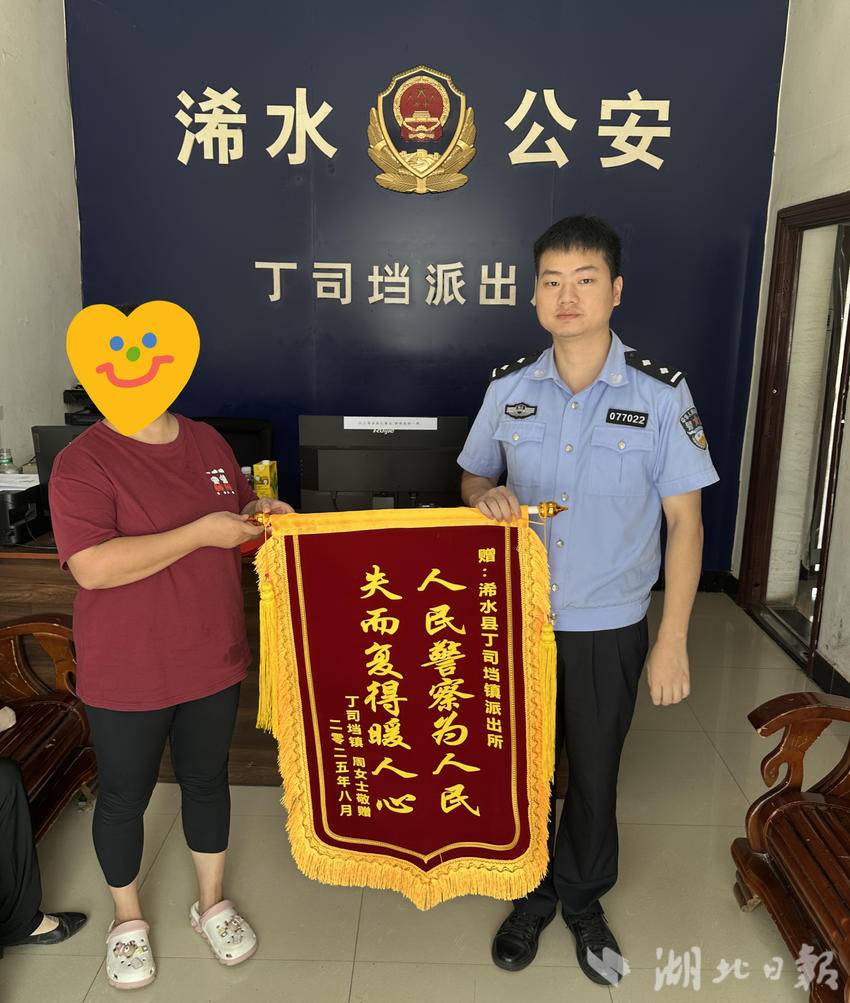 8月8日上午8时许,浠水县丁司垱镇居民周女士报警称在赶集摆摊时手机被盗。丁司垱派出所立即启动“案件快侦”机制,同步上报情报指挥中心。通过综合研判,10时许,民警在一客运班车上将嫌疑人抓获并追回手机。看到被盗手机失而复得,8月13日,周女士将一面印有“人民警察为人民,失而复得暖人心”的锦旗送到派出所。
