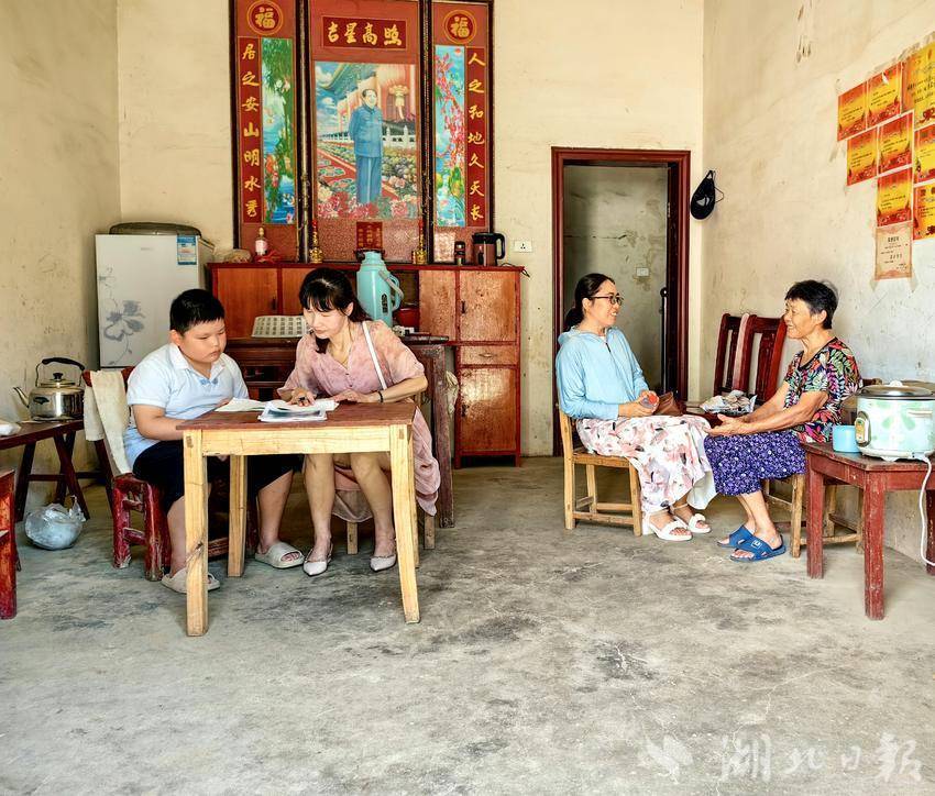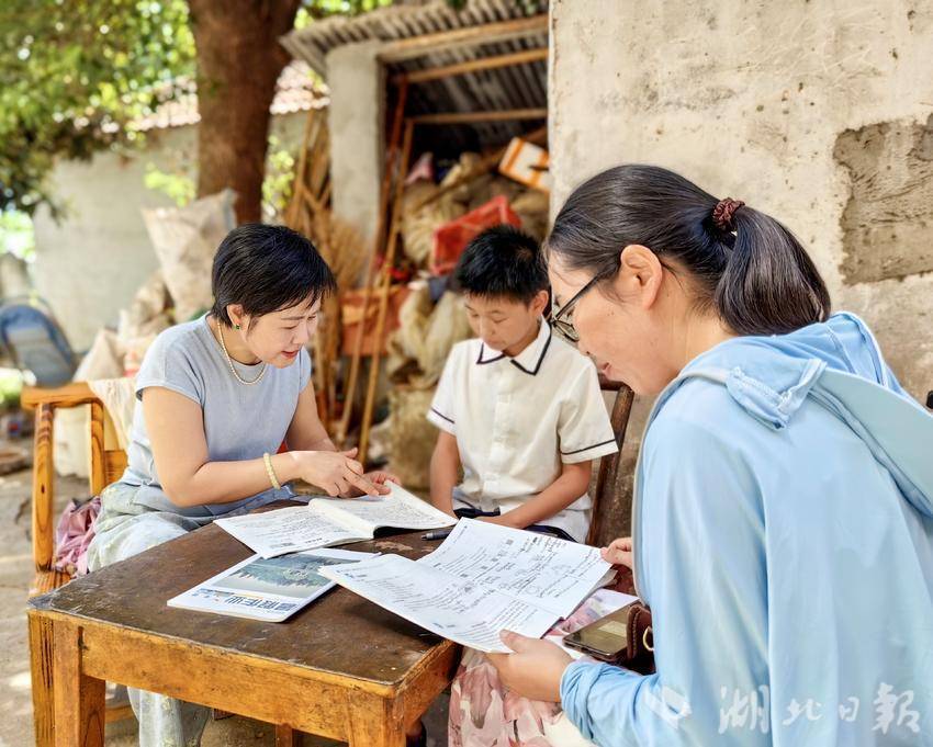 “暑假作业哪道题卡壳了?老师教你!”“千万不能一个人去河边玩,安全第一!”8月18日,骄阳似火,大地如炙,新洲区辛冲街炯伟小学的校长夏玉宝带着涂红霞、江红英、张换喜三位女教师,踩着滚烫的村路,敲响了一户户学生的家门——这是她们今年暑假的第二次“大家访”,而来自特殊家庭、特殊心理、特殊行为、特异体质的“四特”学生,正是此行最牵挂的对象。