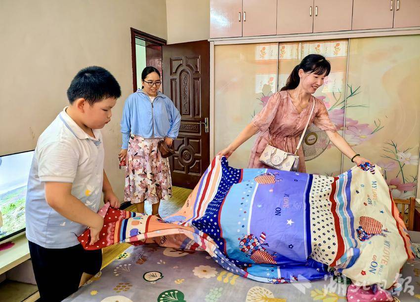 “这么热的天,老师们还特地跑一趟,真是太感谢了!”看着老师们额头的汗水,洪晨曦的爷爷洪艳坤赶紧递上凉水。他说,孩子父母不在身边,老师们上门不仅帮着辅导作业,还教安全知识,“就像家人一样贴心,我们做家长的特别放心。”