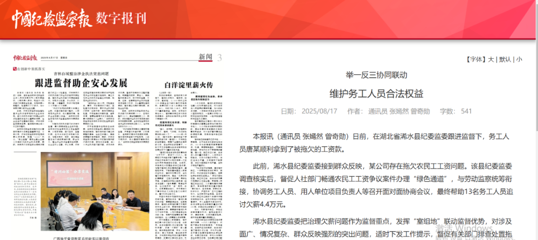 此前,浠水县纪委监委接到群众反映,某公司存在拖欠农民工工资问题。该县纪委监委调查核实后,督促人社部门畅通农民工工资争议案件办理“绿色通道”,与劳动监察统筹衔接,协调务工人员、用人单位项目负责人等召开面对面协商会议,最终帮助13名务工人员追讨欠薪4.4万元。
