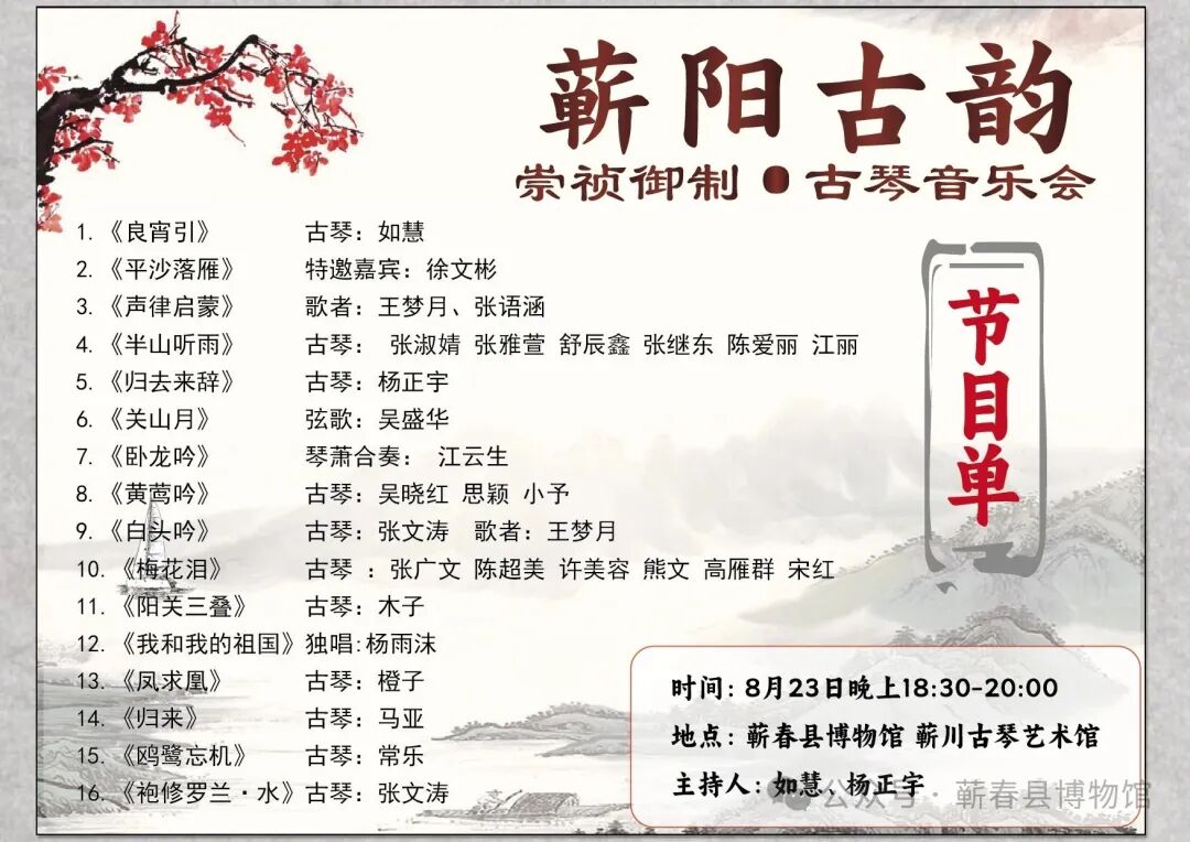 8月23日晚上,夏日轻缓,琴音如水,欢迎您走进这场不喧哗、不张扬的音乐相聚,在七弦之间,听见远方,也听见彼此,在蕲春县博物馆,与千年古韵相遇,不见不散!