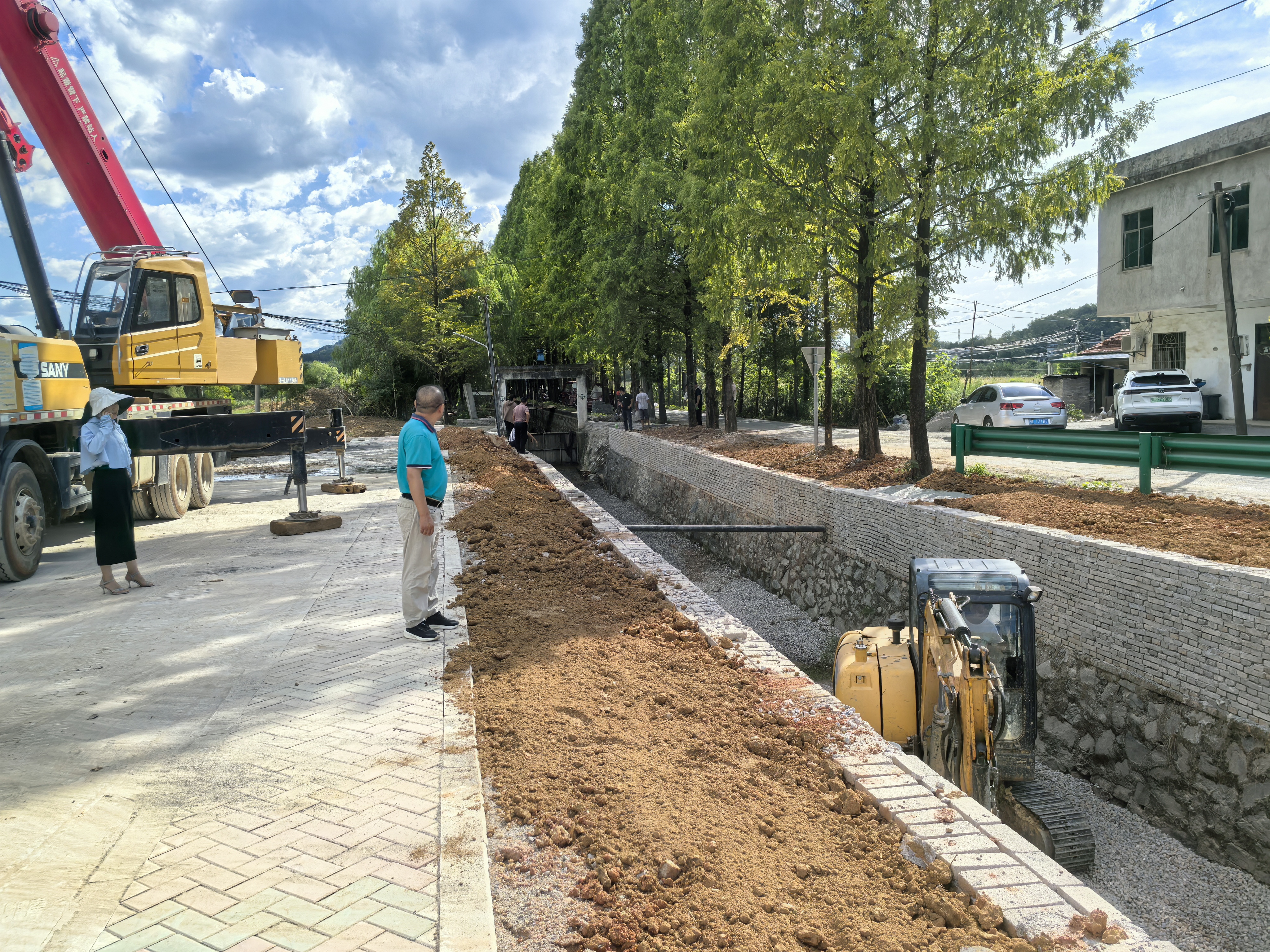 来到横沟桥镇杨畈村“网红路”——三阳路,沿着杉树路边的生态步道已铺就完成,挖掘机正在将旁侧的灌溉河道清淤后以碎石打底,再进行硬化处理。