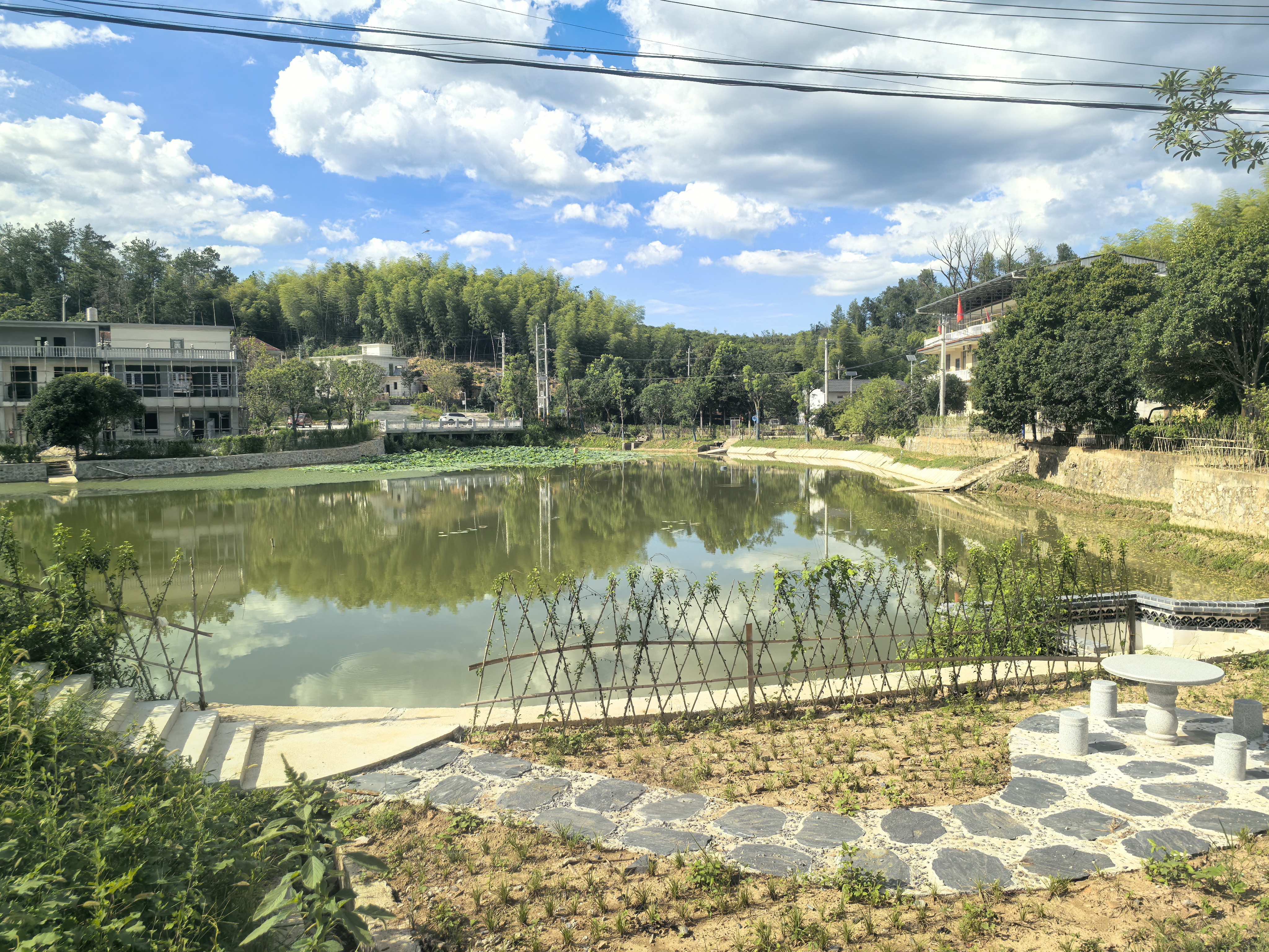 村支书李建国介绍,三次屋场会开下来,村民们的积极性被彻底点燃:6户村民主动捐出组里废弃的工房地基,改造成二十四节气休闲小广场;40多岁的熊盛益腾出300平方米地基,原来破旧的柴火屋变成了养眼的绿化区。目前两个浑浊的水塘已被清淤并打通,种上调节水质的水生植物和莲花,修建了环塘生态步道;木槿花围栏环绕池塘一圈,既保留乡野气息又添浪漫;20多盏太阳能路灯安装一新,古色古香的景观围墙为村湾添彩……